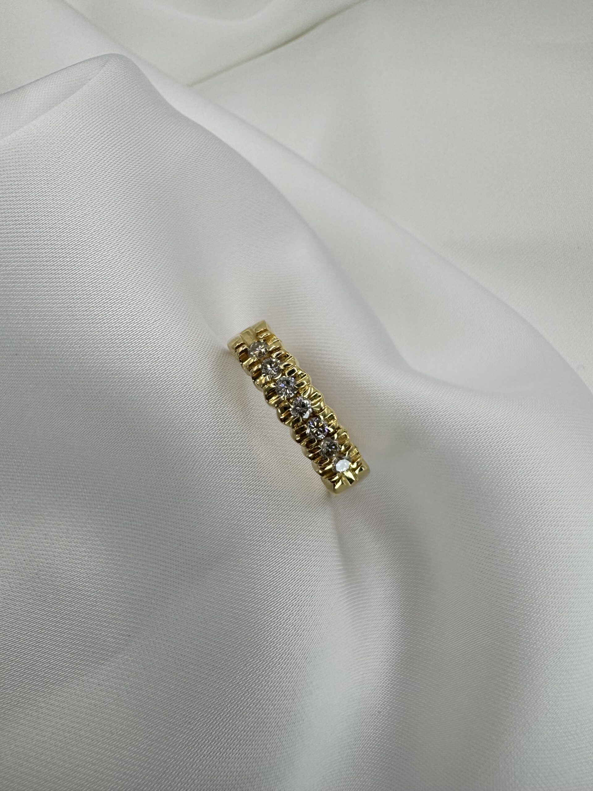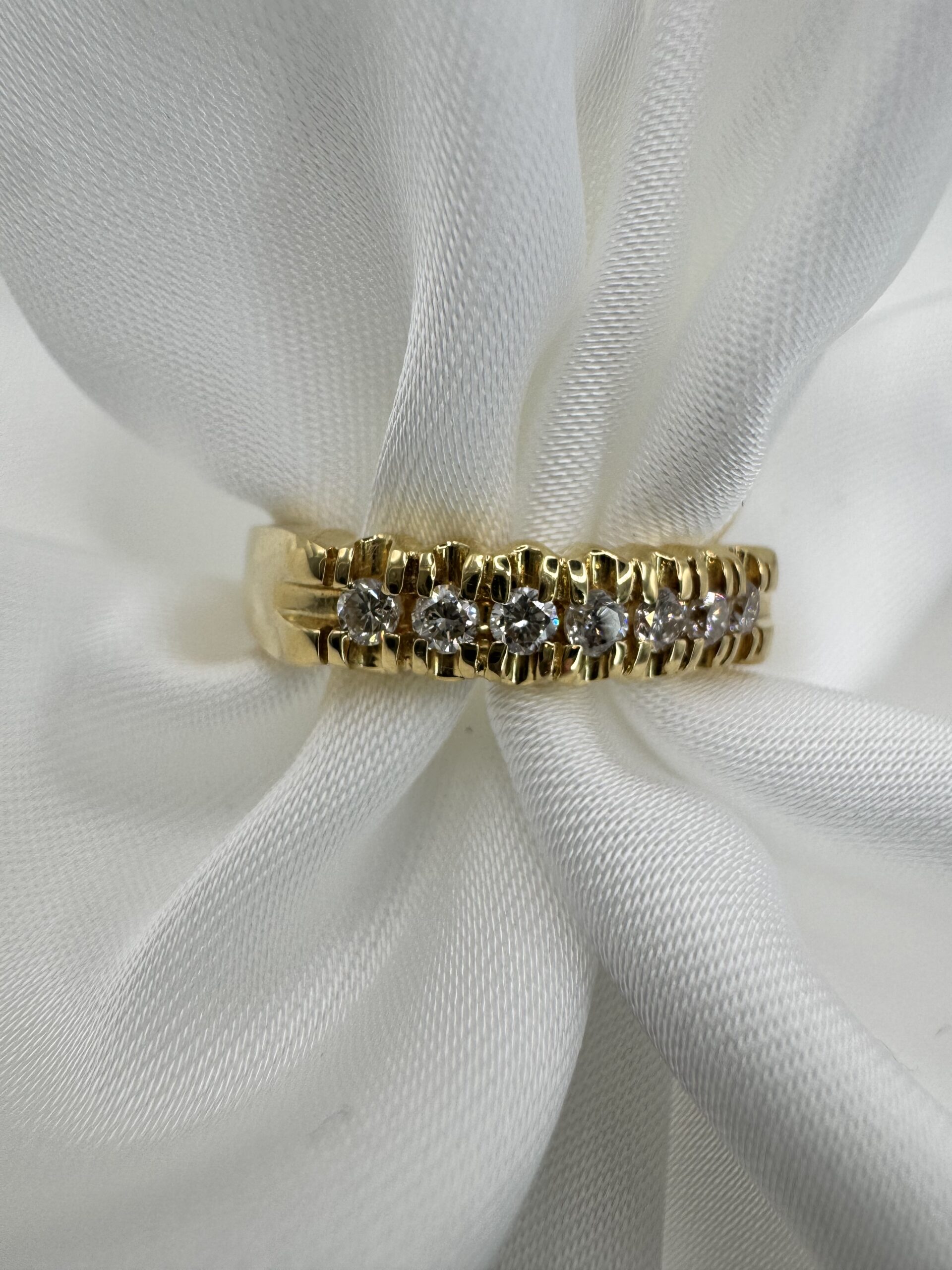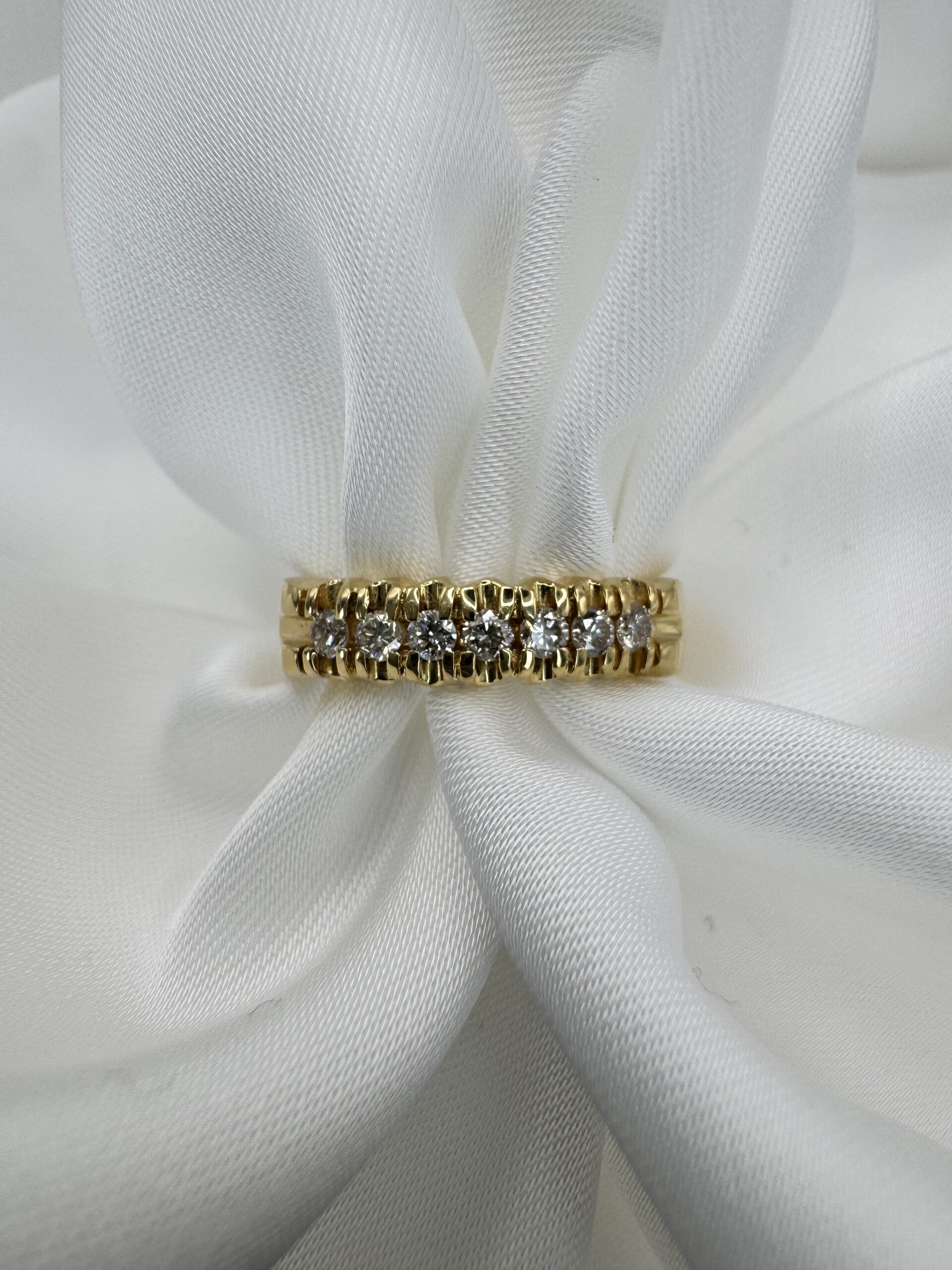 Элегантное и вневременное кольцо с роскошным дизайном, выполненное из желтого золота и инкрустированное рядом сверкающих натуральных бриллиантов, которые эффектно блестят под любым углом. Кольцо сочетает в себе роскошь и элегантную простоту, что делает его идеальным выбором в качестве эффектного подарка или гламурного дополнения к любому образу.