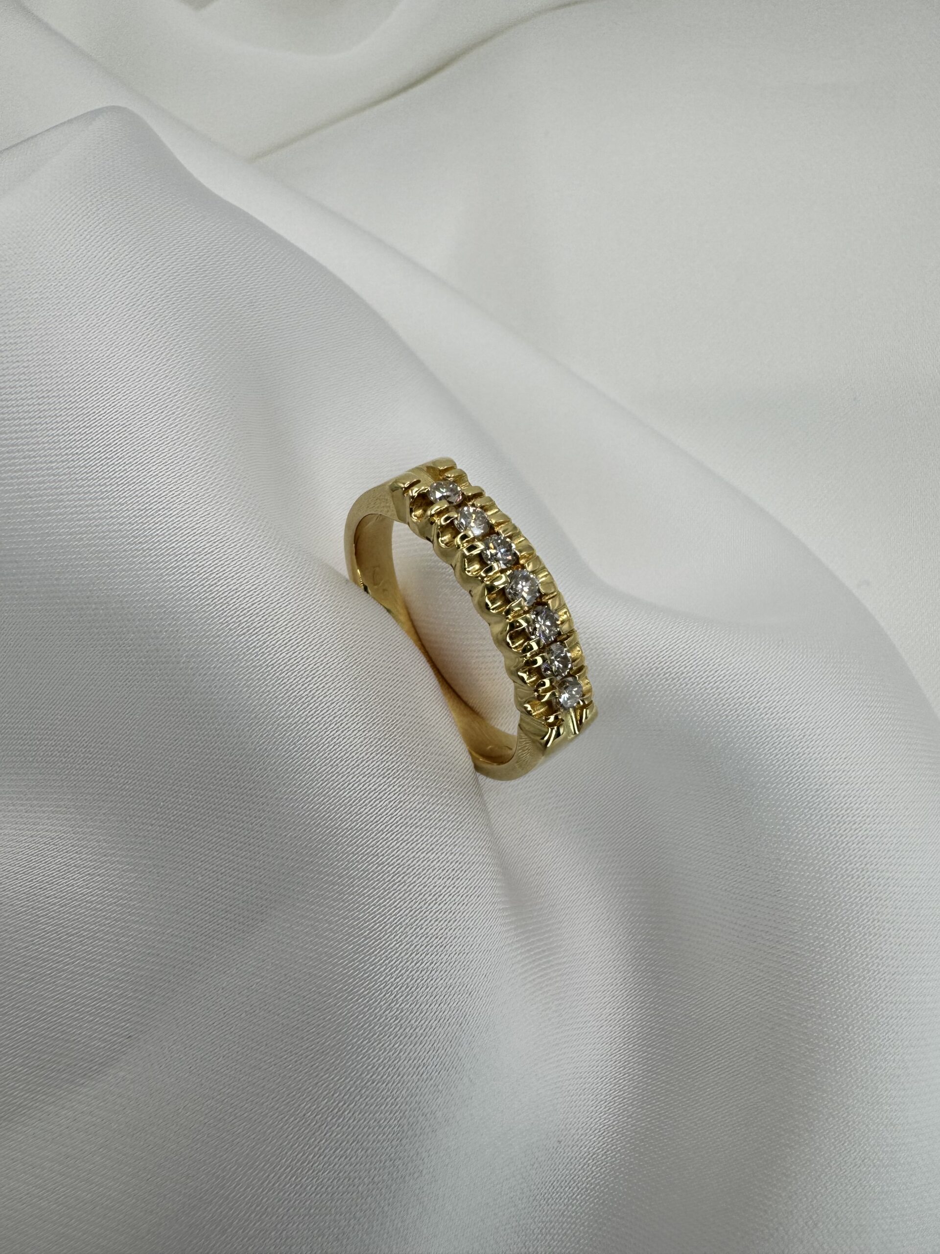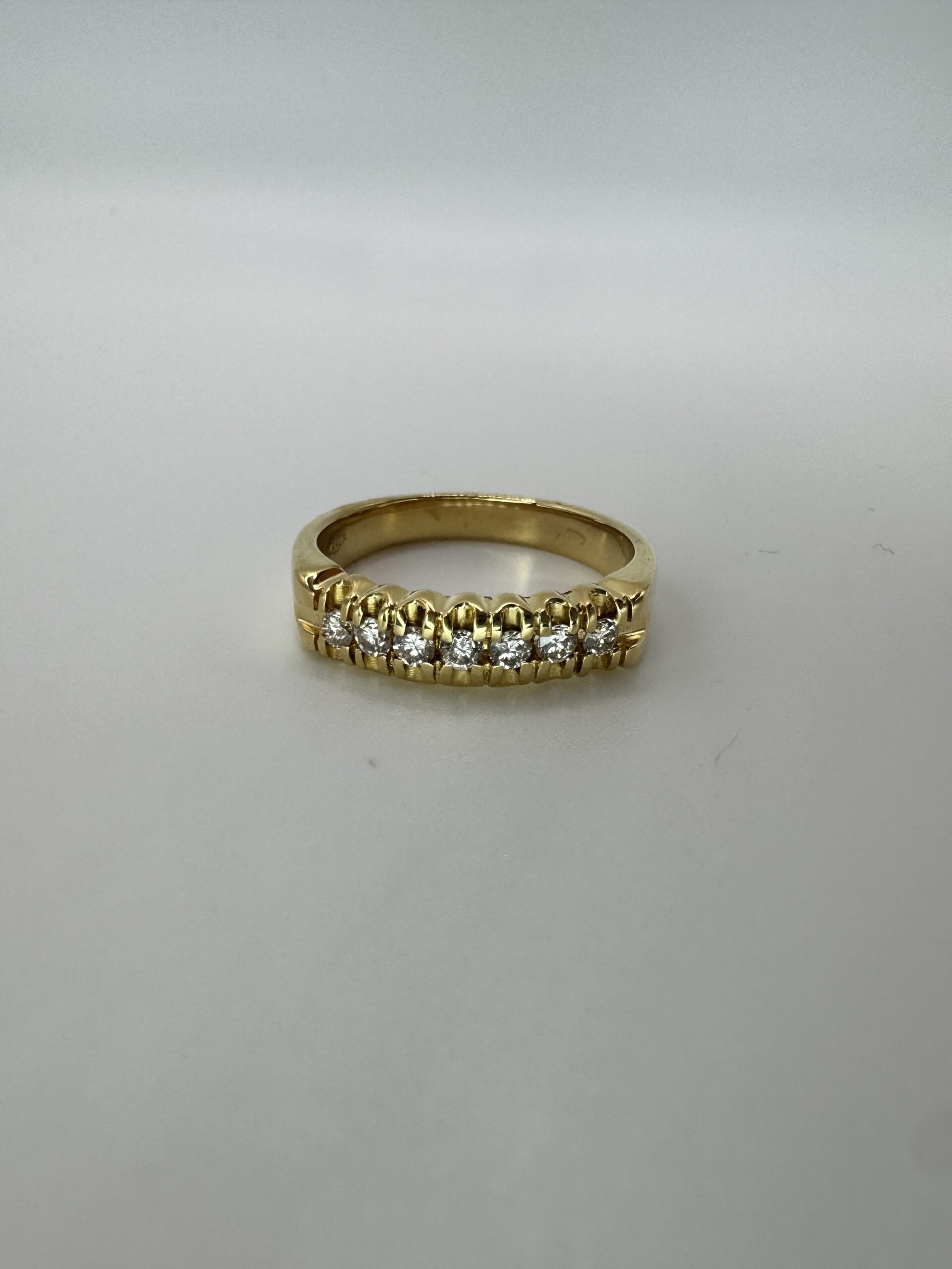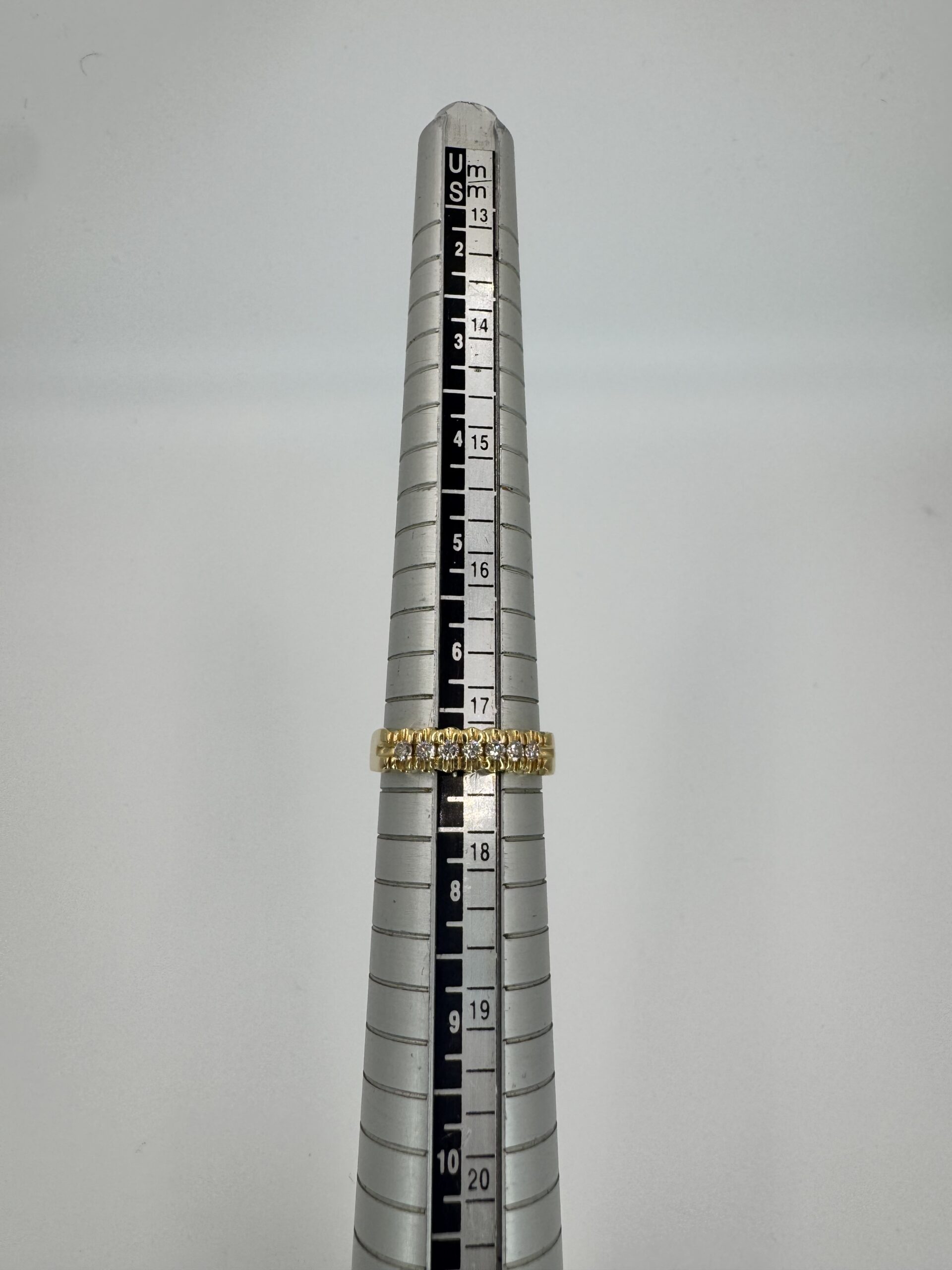 Элегантное и вневременное кольцо с роскошным дизайном, выполненное из желтого золота и инкрустированное рядом сверкающих натуральных бриллиантов, которые эффектно блестят под любым углом. Кольцо сочетает в себе роскошь и элегантную простоту, что делает его идеальным выбором в качестве эффектного подарка или гламурного дополнения к любому образу.